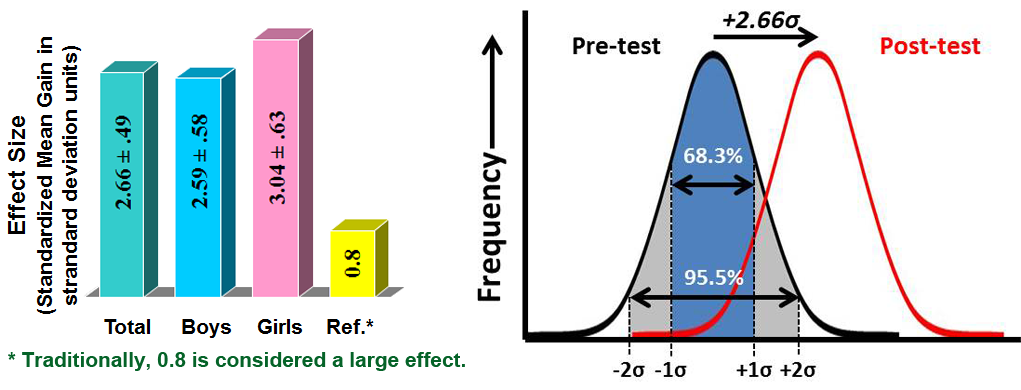 Wherever MWM is introduced, students respond with enthusiasm, creativity and high achievement gains. A large scale national evaluation and assessment study of 118 classrooms in 42 U.S. States had used Materials World Modules as a two-week design supplement to the typical canon of science curricula. The study used a quasi-experimental pre-post design and then aggregated results using meta analytical techniques. On average, classrooms gained 2.66 standard deviations, or an average of 31.8% over their pretest means (see figure below). Girls gained significantly more than boys both in terms of content acquisition and design achievement. However, boys gained more in terms of science esteem. Teachers and students reported improved acquisition of science processes and design skills, and both teachers and students reported being moderately satisfied with the module experience. See study report.